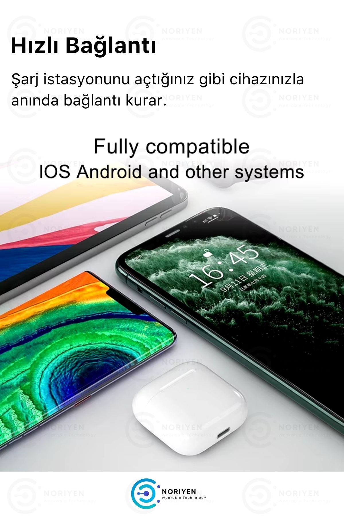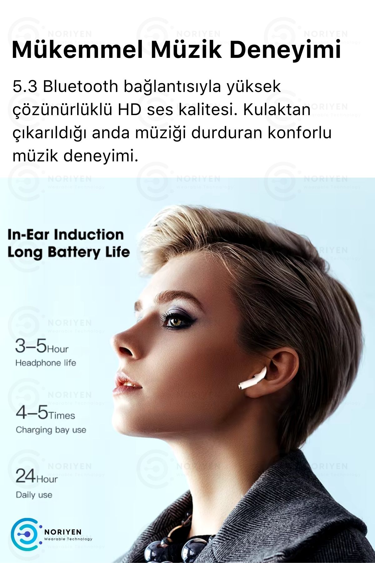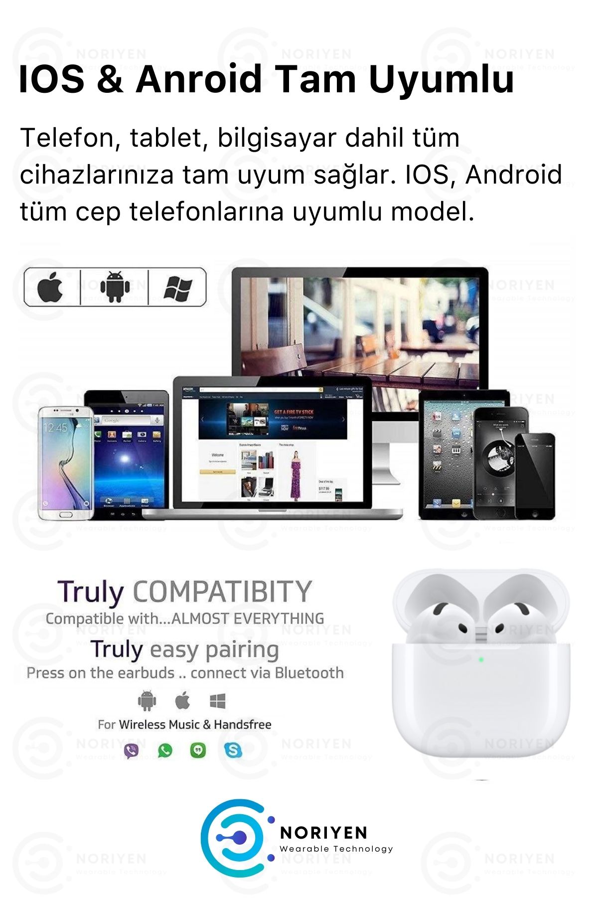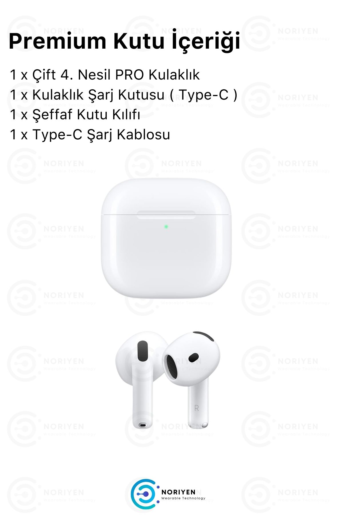 Noriyen kalitesiyle Premium Özel Seri 4. Nesil PRO Bluetooth Kulaklık ; iOS & Android tüm telefon, tablet ve bilgisayarlara uyumlu.; ; Type-C Kablo HEDİYELİ ; Kutu İçeriği: 1 x Çift Kulaklık / 1 x Kulaklık Şarj Kutusu / 1 x Şeffaf Kulaklık Kılıfı / 1 x Askı İpi / 1 x Type-C Kablo ; Bluetooth 5.3 bağlantısıyla yüksek çözünürlüklü stereo HD ses kalitesi ; Aktif Gürültü Engelleyici ; Kulağa taktığınızda otomatik algılama ; Kulaktan çıkarıldığı anda müzik durur.; ; Hiçbir şekilde ışık yanıp sönmez.; ; Dokunmatik - Oynat + duraklat ; Otomatik komutları kendi isteğinize göre kişiselleştirebilirsiniz.; ; Öncesi sonraki parça geçişleri ; Siri desteği ; Mikrofonlu - Kaliteli ses ile telefon görüşmesi ; Su geçirmez, toza ve tere dayanıklı.; ; Konuşma Süresi : 5 Saat / Kutusuyla Şarj Süresi : 4 Saat ;