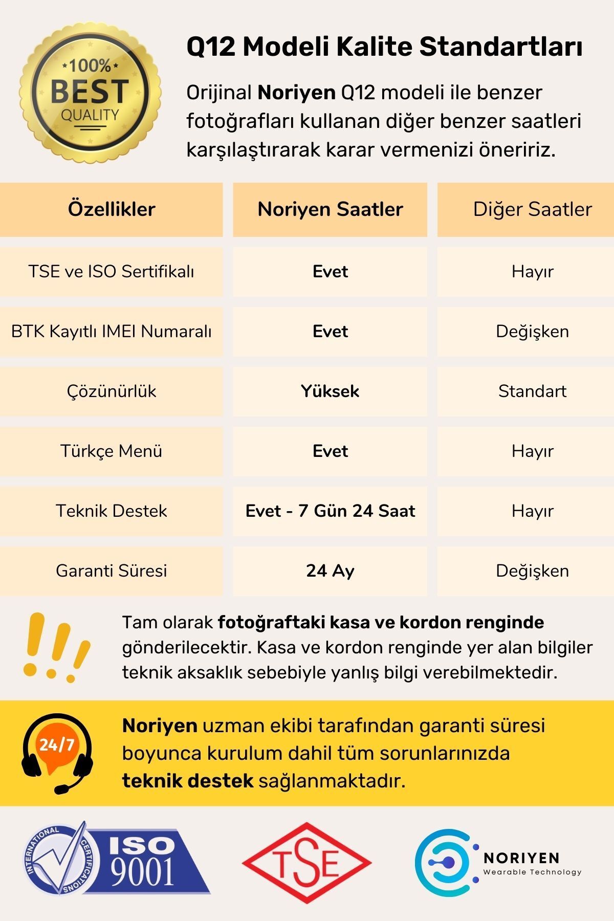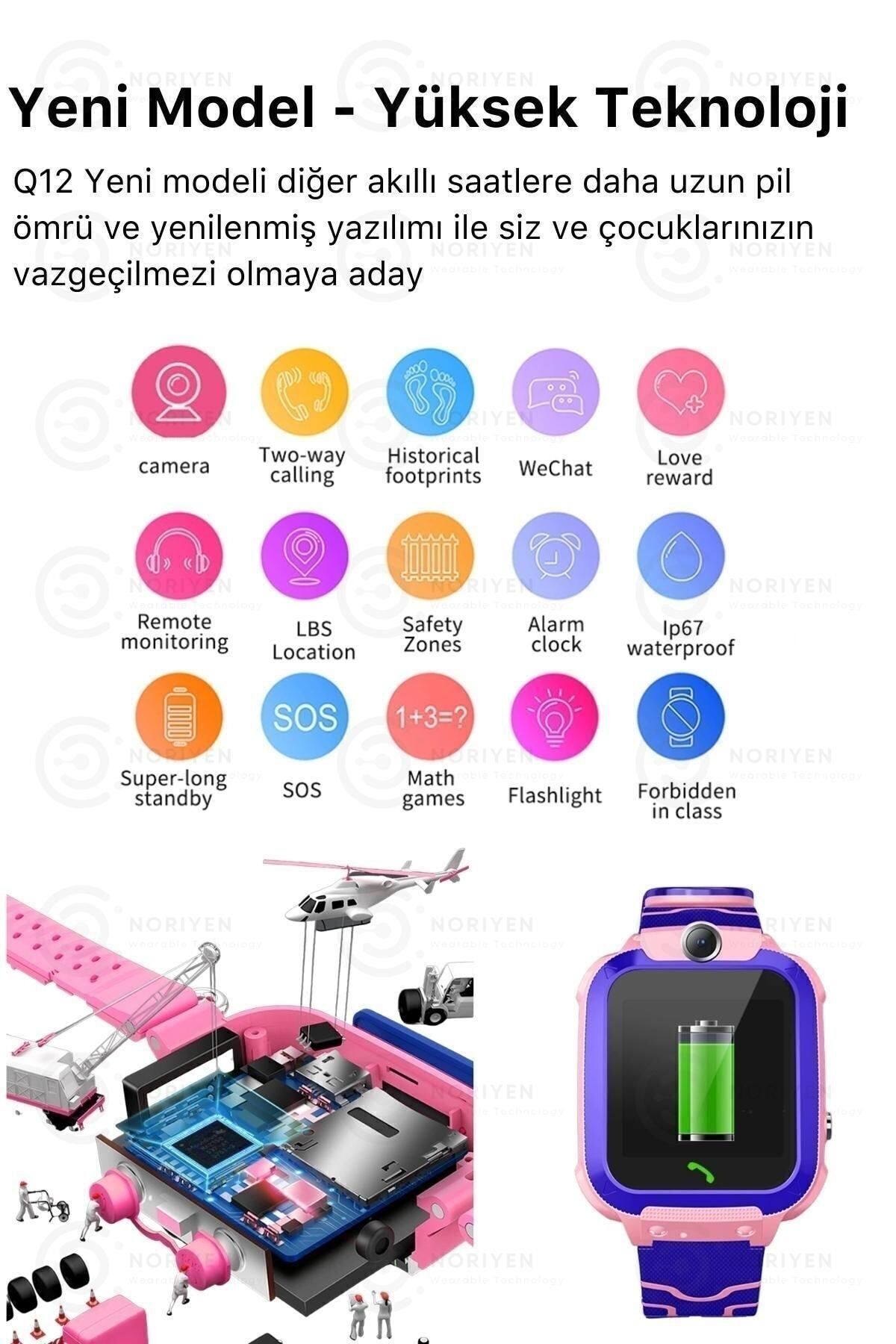 Akıllı Çocuk Saati Öncü Markası Noriyen'den Orijinal BTK Kayıtlı Q12 Akıllı Çocuk Saati ; İmei Kayıtlı ( Resmi BTK Kayıtlı ) ; 24 Ay Resmi İthalatçı Garantili ; Sim Kartlı - Telefon Özellikli ( Tüm Operatörlerin Sim Kartlarına Uyumludur ) ; Siparişiniz Özel Kutulu olarak Akıllı saat + Şarj kablosu + Türkçe kullanım kılavuzu ile birlikte gönderilmektedir. ; Türkçe Menü ( Akıllı Çocuk Saati + Ebeveyn Uygulaması ) ; Ortam Dinleme: Çocuğunuzun bulunduğu ortamı telefonunuzdan dinleyebilirsiniz. ; Konum Takip : Çocuğunuzun nerede olduğunu akıllı telefonunuzdan anlık olarak harita üzerinden görebilirsiniz. ; Güvenli Bölge Takibi : Önceden belirlediğiniz güvenli alan dışına çıkıldığında ebeveyn uygulamasına bildirim alırsınız. ; Ders Modu : Çocuğunuz okuldayken veya ders çalışırken saatle meşgul olmaması için ders modu seçerebilirsiniz. ; Karşılıklı Konuşma: Karşılıklı olarak çocuğunuzla telefon görüşmesi yapabilirsiniz. Önceden sizin belirlediğiniz numaralar harici hiçbir numara aranamaz. ; Yüksek Çağrı Kalitesi: Ses önceki modellere göre daha yüksektir. Gürültülü ortamlarda dahi duyulabilir. ; Yüksek Performanslı Pil: Daha uzun bekleme süresi, hızlı şarj ve yüksek performans. ; Eğlenceli Oyunlar: Çocuklarınız ders zamanları dışında akıllı saatlerinde oyun oynamanın keyfini çıkarabilir. ; SOS Acil Durum Modu: Sos düğmesine 3 saniye basıldığında ebeveynin uygulamasına konum paylaşır ve arama yapar. Ebeveyn telefonu açmazsa telefon açılana kadar sıradaki kayıtlı numaraları aramaya devam eder. ; Sesi Mesaj Gönderme : Çocuk ve ebeveyn arasında karşılıklı olarak sesi mesaj gönderilebilir. ; Anlık Fotoğraf Alma : Uygulama üzerinden çocuğunuzun bulunduğu alanın fotoğrafını alabilirsiniz. ; Ebeveyn uygulamasını Apple Store ve Google Playe Store'dan indirebilirsiniz. ; Diğer Fonksiyonlar : Uzaktan Kapama - Düşük Şarj Uyarısı - LBS ( Baz istasyon ) Konumlandırma - Telefon Rehberi ( Önceden kayıtlı numaralar için çift yönlü çağrı ) - Sesli Mesaj Alma ve Gönderme ; En çok tercih edilen Orijinal Noriyen Akıllı saatleri için Noriyen mağazasını ziyaret edebilirsiniz. ;