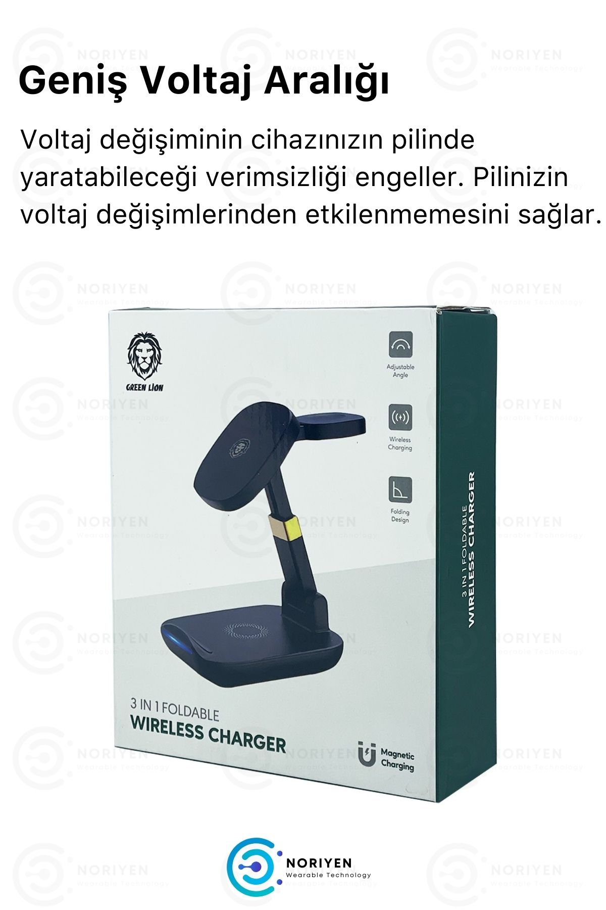 Noriyen Kalitesiyle Premium Serisi 3in1 Şarj İstasyonu ; 3in1 Çok Fonksiyonlu ; Telefon + Kulaklık + Saat Manyetik Şarj ; Manyetik Özellikli Tüm Telefonlara Tam Uyumlu ; Kutu İçeriği : 1 x Manyetik Şarj Standı + 1 x Type-C Şarj Kablosu ; Hızlı Şarj ; Gece Lambası Özellikli ; Şık Tasarım ; Güçlü Manyetik ; Telefonunuzu yatay ya da dikey yerleştirebilirsiniz. ; Güvenli şarj için akım korumalıdır. ; Telefonunuzda ısınma yapmaz. ; Uzun süreli kullanım sunar. ; Pil dolduğunda şarjı durduran yerleşik çoklu koruma sistemine sahiptir. ; Pil ömrünüzü en üst düzeye çıkarır ;