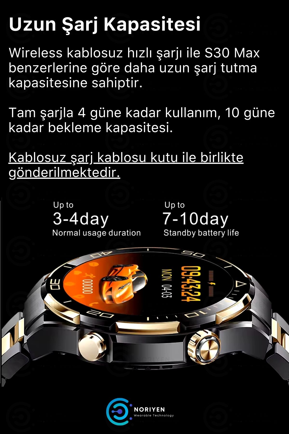 Yeni Nesil Premium Serisi S30 Max Akıllı Saat ; En Yeni Teknoloji ve Şıklık Bir Arada ; Yüksek Çözünürlüklü Büyük AMOLED HD Ekran ; Yuvarlak Ekran ; 24 Ay Garantili ; Türkçe Menülü ; Kolay Kurulum & Kullanım ; Siparişiniz Orijinal kutusunda gönderilmektedir.; ; Kutu İçeriği: 1 Adet Akıllı Saat - 1 Adet Metal Kordon - 1 Adet Silikon Kordon - 1 Adet Wireless Şarj Aleti - 1 Adet Kullanım Kılavuzu ; Paslanmaz Çelik Saat ve Kordon ; 1.62 İnç Yeni Nesil HD Ekran ; 5.0 Bluetooth ile yüksek kaliteli çağrı cevaplama ve arama yapma özelliği ; NFC & Siri Ses Asistanı Destekli ; Wireless Kablosuz Şarjlı ; Uzun Şarj Tutma Kapasitesi : 4 Gün Çalışma / 10 Gün Bekleme Süresi ; Iphone Ios ve Android - Tüm Telefonlara Uyumlu ; Whatsapp - SMS dahil telefon bildirimlerinizi anında alırsınız.; ; Saat üzerinden bluetooth üzerinden telefon görüşmesi yapılabilmektedir.; Gelen aramayı cevaplayabilir ve saat üzerinden telefon görüşmesi yapabilirsiniz.; ; Ses Asistanı Destekli ; Sağlık İzleme: Nabız ölçer, uyku izleyici, kan basıncı, tansiyon, ekg ve vücut sıcaklığı ölçer ; Adımlarınızı hesaplayarak yaktığınız kalori miktarını ve kalp ritminizi paylaşır.; ; Spor Modları: Kapalı koşu, bisiklet, yüzme, bisiklet, yürüyüş, basketbol, masa tenisi, tırmanma, yoga vb.; ; Akıllı hatırlatıcılar: Su içme ve uzun süre hareketsizlik hatırlatmaları yapar ; 5.0 Bluetooth bağlantı ile yüksek kaliteli müzik keyfi ; Suya dayanıklı modeli ile günlük kullanımda basınçlı sıcak su, deniz ve havuz dışında su geçirmez.; ; Uzaktan kamera: Bilediğinizi sallayarak uzaktan telefonunuzla fotoğraf çekebilirsiniz.; ; Türkçe dahil çoklu dil seçeneği ; Diğer özellikler: Saatimi bul ve telefonumu bul özelliği, suya ve toza dayanıklı çerçeve, bölünebilir ekran, uyandırma, hesap makinesi, alarm, kronometre, hava durumu, kordon değişimi yapılabilir ; En çok tercih edilen Orijinal Noriyen Garantili Akıllı saatler için Noriyen mağazasını ziyaret edebilirsiniz.