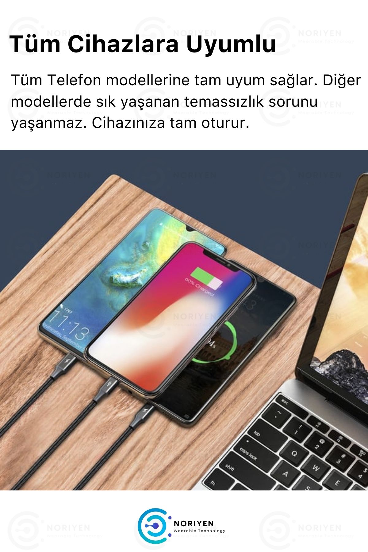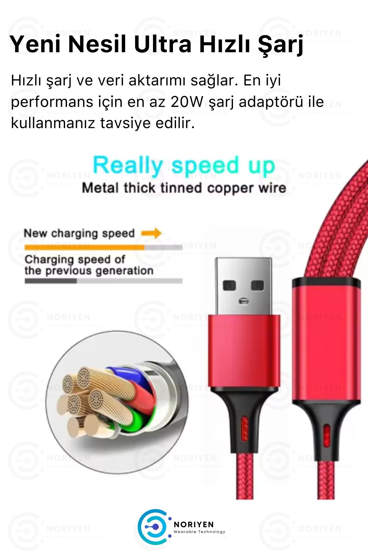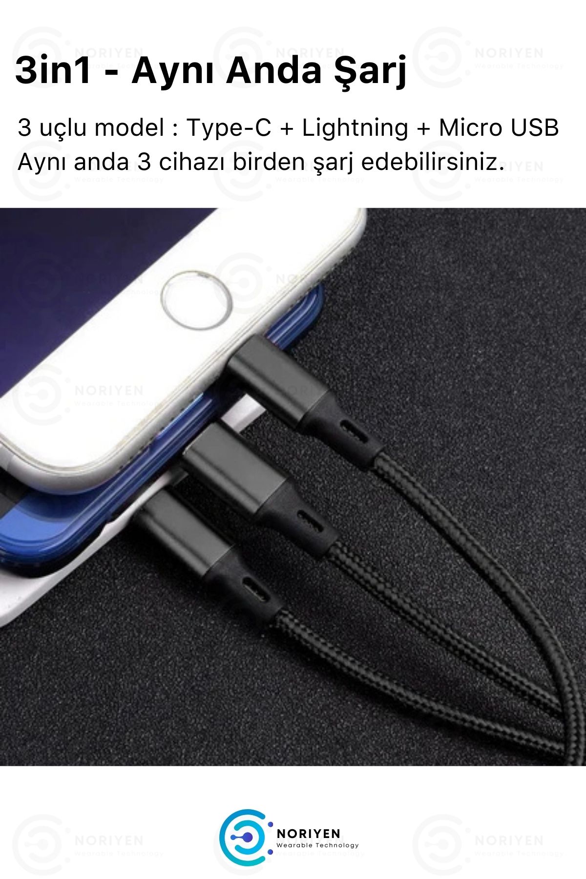 Noriyen kalitesiyle Yeni Nesil Süper Hızlı 3in1 Şarj Kablosu ; 3 Uçlu ( Micro USB + Type-C + Lightning ) ; Aynı anda 3 Telefonu birden şarj edebilir.; ; Turbo ve Hızlı Şarj destekli.; ; Tüm Telefonlara Uyumludur.; ; Temassızlık yapmaz.; ; Cihazınıza tam oturur.; ; Güvenli şarj için akım korumalıdır.; ; Hızlı Veri Transferi ; Pil ömrünüzü en üst düzeye çıkarır.