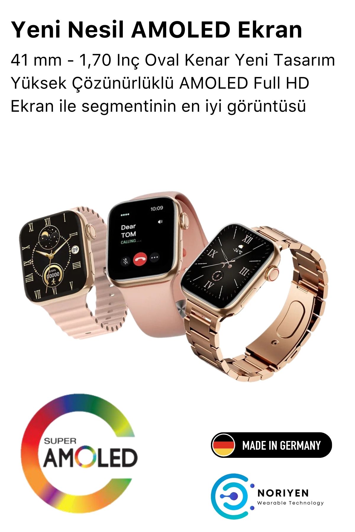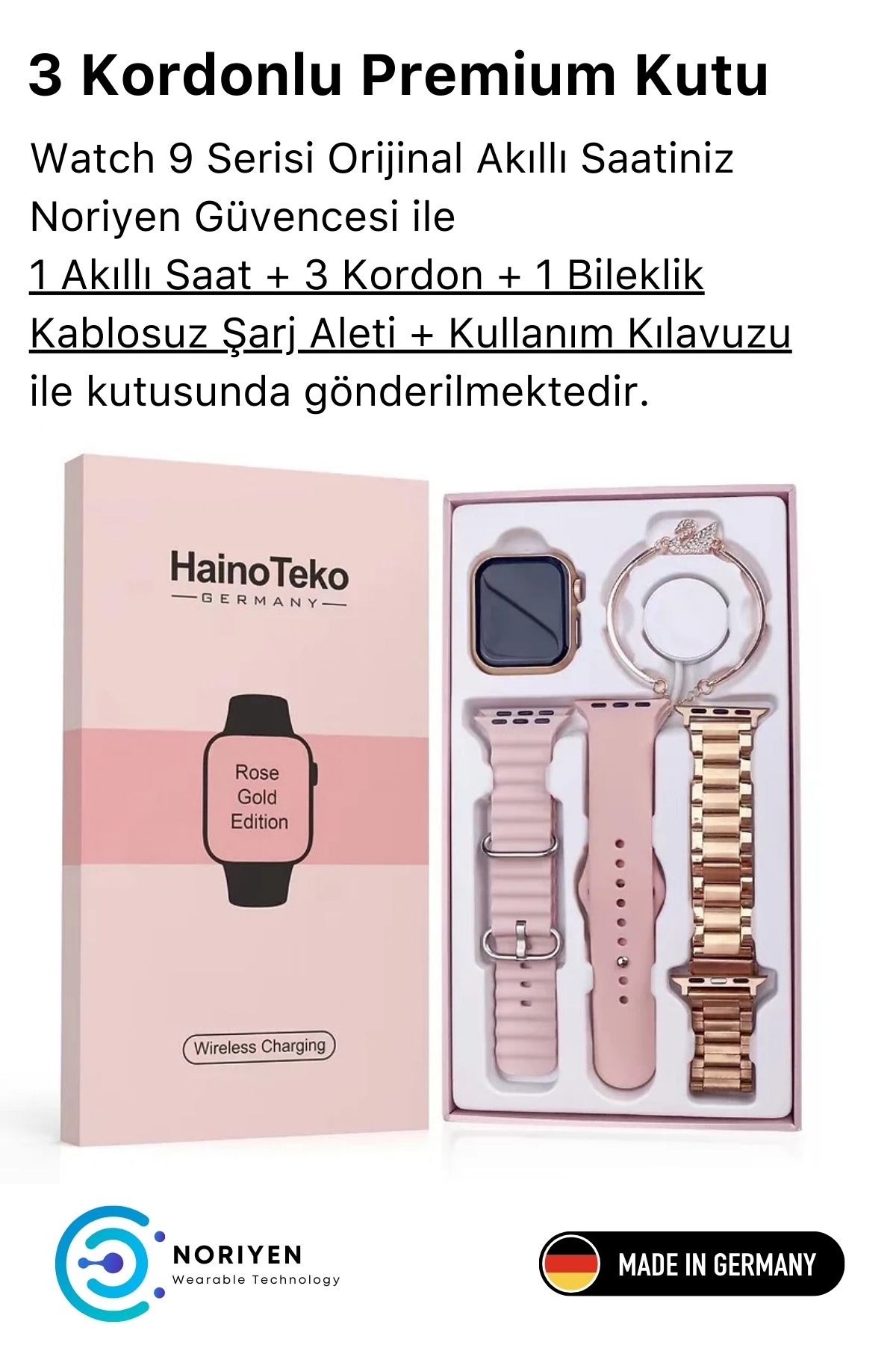 Orijinal Watch 9 Serisi Yeni Nesil Mini Kadın Akıllı Saat ; Kadınlara Özel Yeni Tasarım ; Şık Kombin Bileklik HEDİYELİ ; Almanya Üretimi Ultra Dayanıklı Model ; Wireless Şarjlı Özel Seri ; Kutu İçeriği: Mini Akıllı Saat + 3 Kordon + Hediye Bileklik + Wireless Şarj Kablosu + Kullanım Kılavuzu ; Özel Pembe Kutulu : Hediye için sık tercih edilmektedir.; ; Türkçe Menülü ; 41 mm Kavisli Oval Kenarlı Yeni Tasarım Kasa ; Kolay Kurulum & Kullanım ; 24 Ay Garantili ; Iphone Ios ve Android - Tüm Telefonlara Uyumlu ; Siparişiniz Orijinal kutusunda gönderilmektedir.; ; 5.1 Bluetooth ile yüksek kaliteli çağrı cevaplama ve arama yapma özelliği ; 1,70 İnç AMOLED Teknolojili Yüksek Çözünürlüklü HD Ekran ; Lityum İyon Polimer 280 Mah Pil ile Uzun Şarj Tutma Kapasitesi ; Normal Kullanımda 3 Gün, Bekleme Modunda 45 Gün Şarj Tutma ; Sağlık İzleme: Nabız ölçer, uyku izleyici, kan basıncı, tansiyon, ekg ve vücut sıcaklığı ölçer ; Adımlarınızı hesaplayarak yaktığınız kalori miktarını ve kalp ritminizi paylaşır.; ; 117 Adet Spor Modu: Kapalı koşu, bisiklet, yüzme, bisiklet, yürüyüş, basketbol, masa tenisi, tırmanma, yoga vs.; ; Akıllı hatırlatıcılar: Su içme ve uzun süre hareketsizlik hatırlatmaları yapar ; Tüm bildirim ve mesajlar anında akıllı saatinizde ; Bluetooth bağlantı ile yüksek kaliteli müzik keyfi ; Uzaktan fotoğraf çekme özelliği ; Suya dayanıklı modeli ile günlük kullanımda sıkça tercih edilmektedir.; ; Basınçlı sıcak su, deniz ve havuz dışında su geçirmez.; ; Türkçe dahil çoklu dil seçeneği ; Diğer özellikler: Saatimi bul ve telefonumu bul özelliği, suya ve toza dayanıklı çerçeve, bölünebilir ekran, uyandırma, hesap makinesi, alarm, kronometre, hava durumu, kordon değişimi yapılabilir ; En çok tercih edilen Orijinal Noriyen Garantili Akıllı saatler için Noriyen mağazasını ziyaret edebilirsiniz.; ;