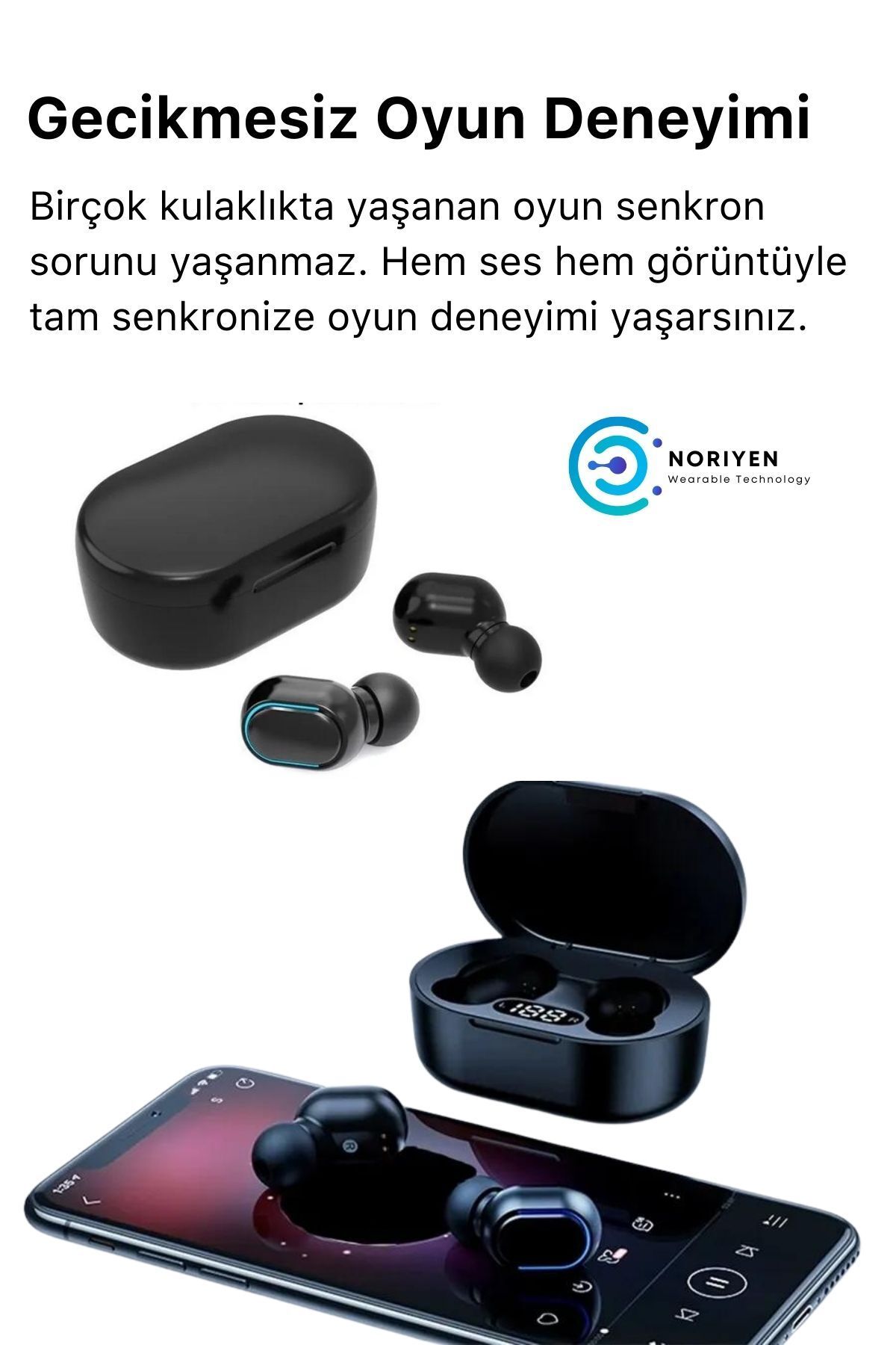 Noriyen kalitesiyle Yeni Nesil E7S Dots Bluetooth Kulaklık ; Kutu İçeriği: 1 x Powerbank Özellikli Kutusu / 2 x Kulaklık / 1 x Şarj Kablosu / Yedek Kulak İçi Silikonları ; Full Stereo HD + Ekstra Bass ile Eşsiz Müzik Deneyimi ; Oyuncular için Özel : Ses Gecikmesiz Senkronizasyon ; Aktif Gürültü Engelleyici Özellik : Dış ortamdan gelen gürültüyü tamamen engeller.; Eşsiz bir oyun deneyimi sunar.; ; LED Göstergeli : Şarjı sürekli takip edebilirsiniz.; ; Şarj Kutusu ayrıca powerbank olarak kullanılabilmektedir.; Şarj kutusuyla telefonunuzu da şarj edebilirsiniz.; ; Tüm IOS ve Android telefonlara uyumludur.; ; Bluetooth 5.0 bağlantısıyla yüksek çözünürlüklü Ultra HD Ses Kalitesi ; Ergonomik Tasarım ile kulaklarınızla tam uyumlu ; Dokunmatik - Oynat + duraklat ; Otomatik bağlantı özelliği ile cihazınıza bir defa bağlandıktan sonra kapsama alanına her girdiğinde otomatik bağlanır.; ; Çift Mikrofonlu - Kaliteli ses ile telefon görüşmesi ; IPX4 Su Geçirmezlik ; Portatif şarj istasyonunun kapağını açtığınız gibi anında telefonunuza bağlanır.; Uzun süre bağlanmasını beklemezsiniz.; ;