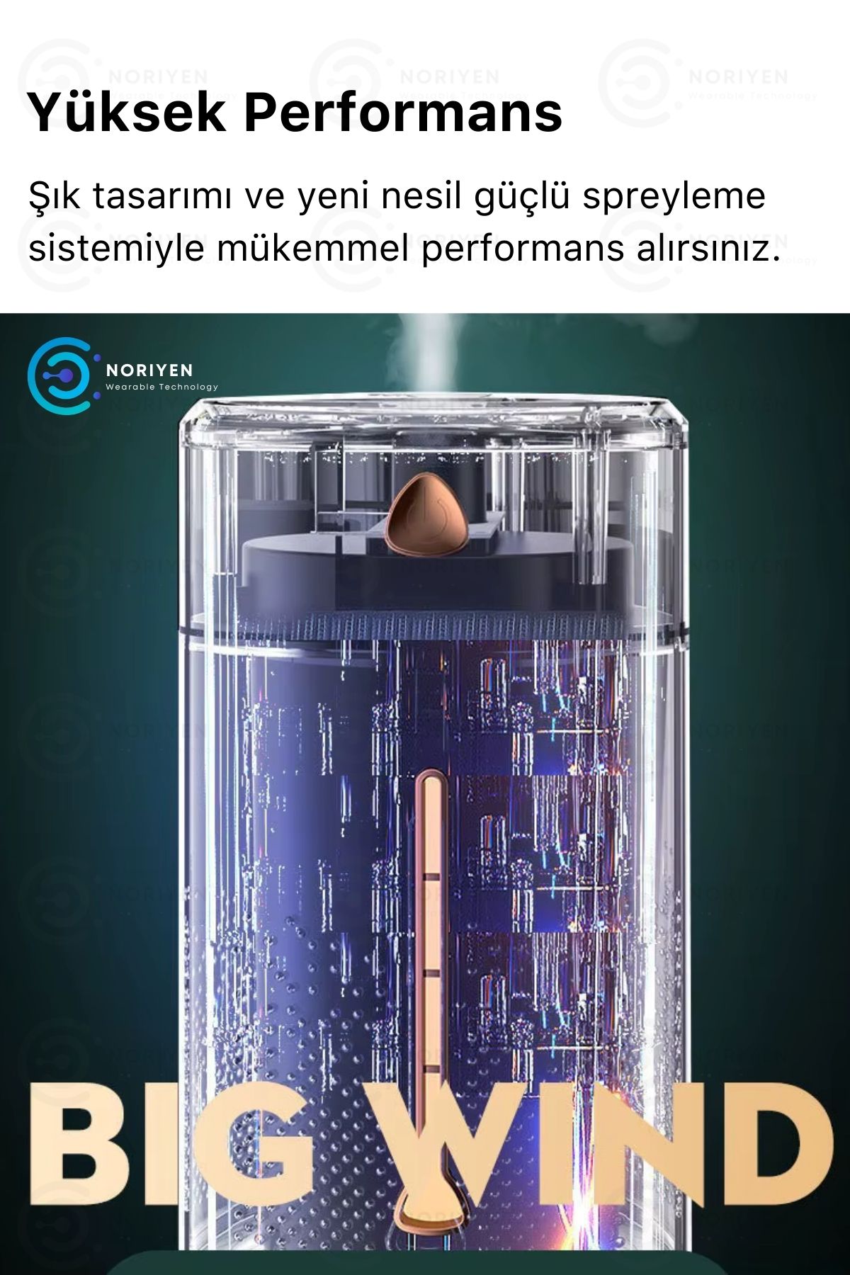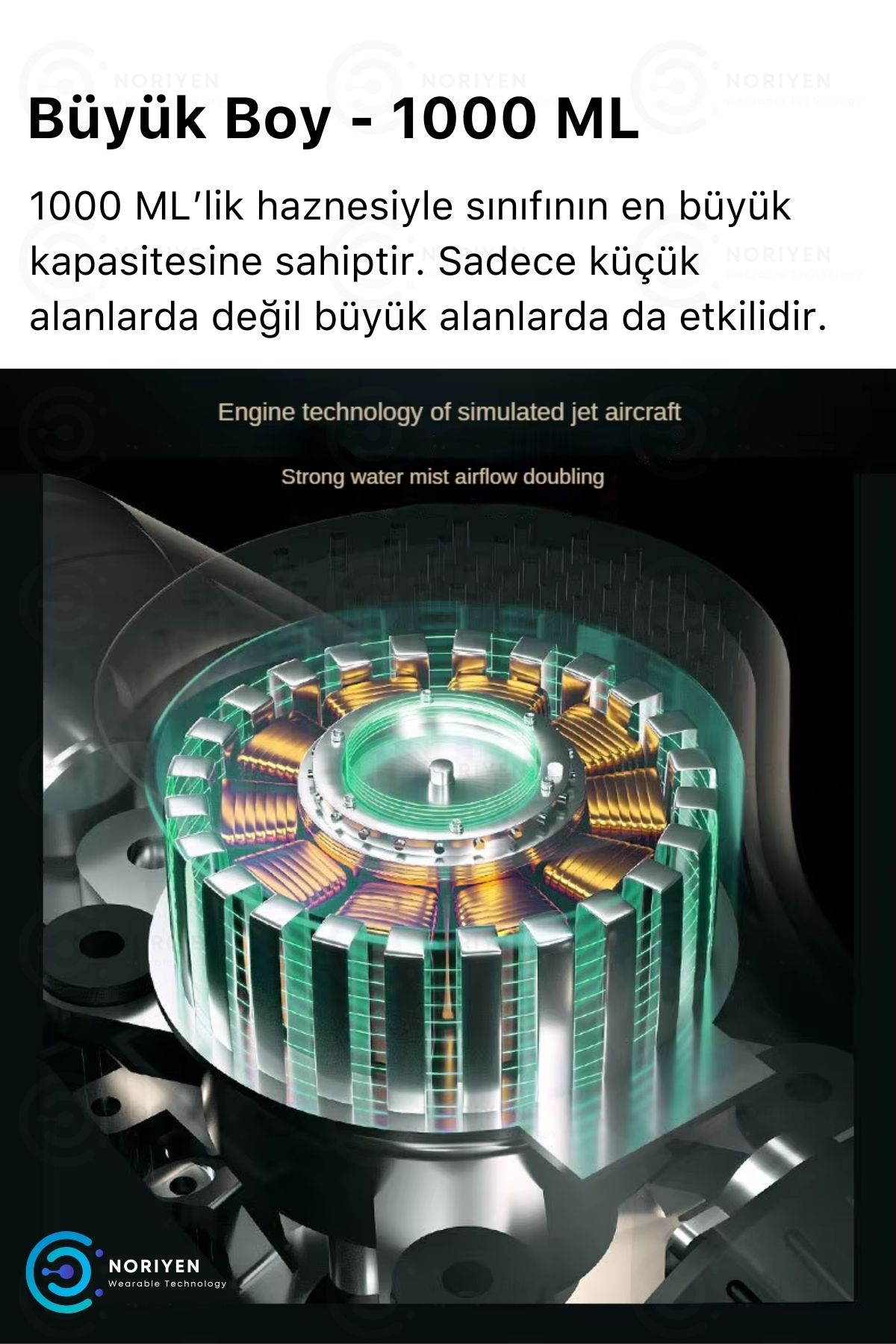 Noriyen kalitesiyle Yeni Nesil Ultrasonik Büyük Boy Hava Nemlendirici - 1000 ML ; Nano Ölçekli Lüks Model ; Gümüş İyon Teknolojisi ; Ultra Sessiz Premium Model ; Geniş Su Tankı: 1000 ML su tankı ile uzun süreli kullanım imkanı ; Renkli Işıklandırma: Odanıza modern bir hava katan 7 farklı renk seçeneği ; Yüksek Sprey Hacmi: 70 ml/saat sprey hacmi ile etkili nemlendirme ; Gece Işığı Modlu ; Aroma Terapi Difüzör ; Otomatik Kapanma Özellikli ( 1 - 3 - 6 Saate Ayarlanabilir ) ; Priz ile çalışır - Şarjlı değildir.; ;