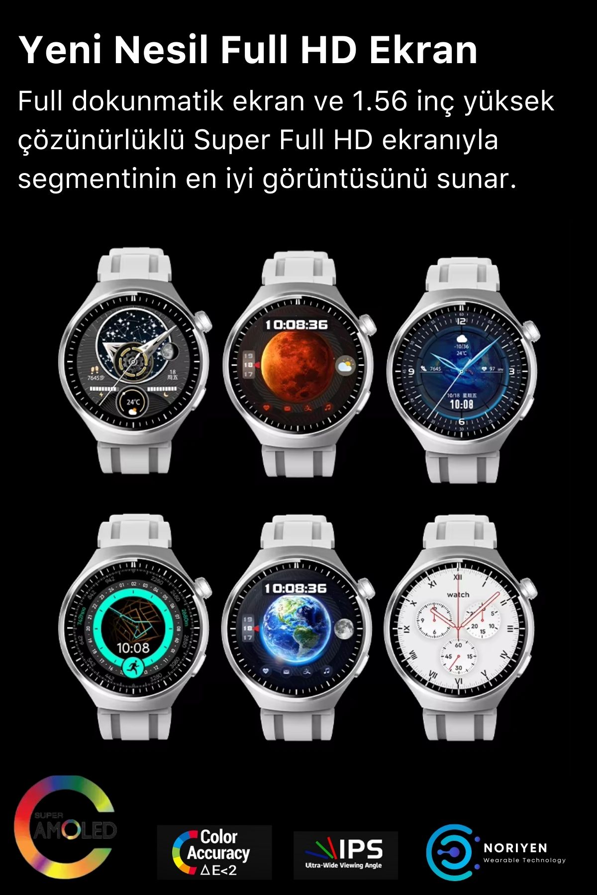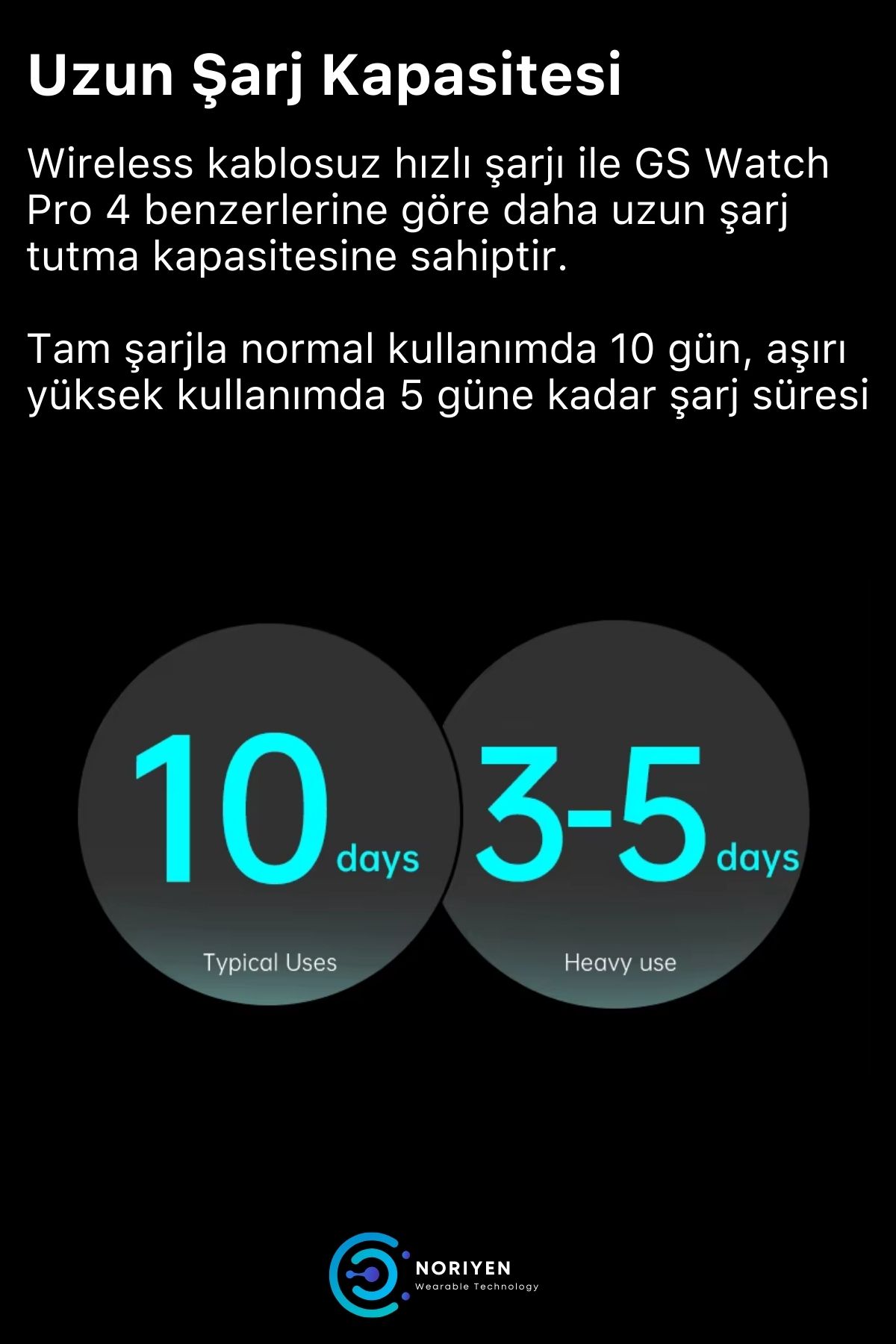 Orijinal Premium Serisi GS Watch Pro 4 Akıllı Saat ; Türkçe Menülü ; Kolay Kurulum & Kullanım ; 24 Ay Garantili ; 2 Kordonlu Özel Paket ; Iphone Ios ve Android - Tüm Telefonlara Uyumlu ; Siparişiniz Orijinal kutusunda gönderilmektedir.; ; Kutu İçeriği: Akıllı saat + Metal Kordon + Silikon Kordon + Türkçe Kullanım Kılavuzu ; Uzun ömürlü Lityum Şarj ; 5.3 Bluetooth ile yüksek kaliteli çağrı cevaplama ve arama yapma özelliği ; 1.56 İnç Yüksek Çözünürlüklü HD Ekran ; Uzun şarj tutma kapasitesi ; Sağlık İzleme: Nabız ölçer, uyku izleyici, kan basıncı, oksijen, tansiyon, ekg ve vücut sıcaklığı ölçer ; Adımlarınızı hesaplayarak yaktığınız kalori miktarını ve kalp ritminizi paylaşır.; ; Spor Modları: Kapalı koşu, bisiklet, yüzme, bisiklet, yürüyüş, basketbol, masa tenisi, tırmanma, yoga ; Akıllı hatırlatıcılar: Su içme ve uzun süre hareketsizlik hatırlatmaları yapar ; Tüm bildirim ve mesajlar anında akıllı saatinizde ; Bluetooth bağlantı ile yüksek kaliteli müzik keyfi ; IP67 Su geçirmezlik sertifikalı ; Dokunmatik ekran + aktif yan tuşlu ; Uzaktan kamera: Bilediğinizi sallayarak uzaktan telefonunuzla fotoğraf çekebilirsiniz.; ; Türkçe dahil çoklu dil seçeneği ; Diğer özellikler: Saatimi bul ve telefonumu bul özelliği, suya ve toza dayanıklı çerçeve, bölünebilir ekran, uyandırma, hesap makinesi, alarm, kronometre, hava durumu, kordon değişimi yapılabilir ; En çok tercih edilen Orijinal Noriyen Garantili Akıllı saatler için Noriyen mağazasını ziyaret edebilirsiniz.