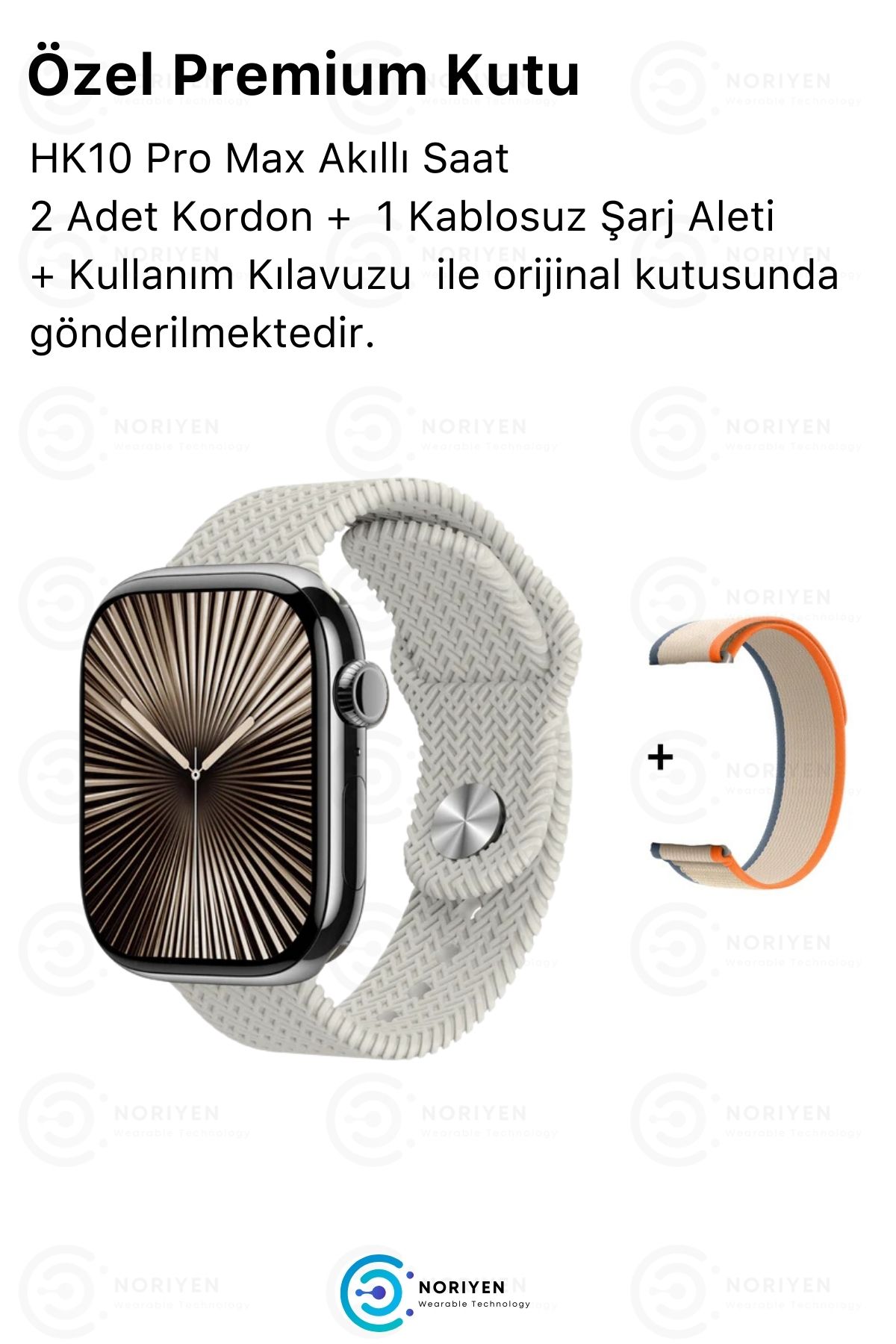 Noriyen Kalitesiyle Yeni Nesil HK10 Pro Max Akıllı Saat ; Watch 10 Series - Yeni Kasa Tasarım ; En Yeni Teknoloji ve Şıklık Bir Arada ; ChatGPT ile tam senkronlu çalışma ; Wireless Kablosuz Şarj ; Mevcut kordonuna EK olarak HEDİYE kordon gönderilmektedir.; ; Yüksek Çözünürlüklü Süper AMOLED HD Ekran ; 24 Ay Garantili ; Türkçe Menülü ; Kolay Kurulum & Kullanım ; Siparişiniz Orijinal kutusunda gönderilmektedir.; ; Ekran Boyutu: 2.12" AMOLED ; Çözünürlük:485*520 ; Bluetooth: BT 5.3 ; Boyutlar: 46 x 36 x 11 mm ; Bluetooth ile yüksek kaliteli çağrı cevaplama ve arama yapma özelliği ; Uzun Şarj Tutma Kapasitesi ; Tek Tıkla Bağlantı: Kolay Eşleştirmeyi destekler.; ; Iphone Ios ve Android - Tüm Telefonlara Uyumlu ; Tüm telefon bildirimlerinizi anında alırsınız.; ; Saat üzerinden bluetooth üzerinden telefon görüşmesi yapılabilmektedir.; ; Gelen aramayı cevaplayabilir ve saat üzerinden telefon görüşmesi yapabilirsiniz.; ; Sağlık İzleme: Nabız ölçer, uyku izleyici, kan basıncı, tansiyon, ekg ve vücut sıcaklığı ölçer.; ; Adımlarınızı hesaplayarak yaktığınız kalori miktarını ve kalp ritminizi paylaşır.; ; Spor Modları: Kapalı koşu, bisiklet, yüzme, bisiklet, yürüyüş, basketbol, masa tenisi, tırmanma, yoga vb.; ; Akıllı hatırlatıcılar: Su içme ve uzun süre hareketsizlik hatırlatmaları yapar ; Bluetooth bağlantı ile yüksek kaliteli müzik keyfi ; Suya dayanıklı modeli ile günlük kullanımda basınçlı sıcak su, deniz ve havuz dışında su geçirmez.; ; Uzaktan kamera: Bilediğinizi sallayarak uzaktan telefonunuzla fotoğraf çekebilirsiniz.; ; Türkçe dahil çoklu dil seçeneği ; Diğer özellikler: Saatimi bul ve telefonumu bul özelliği, suya ve toza dayanıklı çerçeve, bölünebilir ekran, uyandırma, hesap makinesi, alarm, kronometre, hava durumu, kordon değişimi yapılabilir ; En çok tercih edilen Orijinal Noriyen Garantili Akıllı saatler için Noriyen mağazasını ziyaret edebilirsiniz.